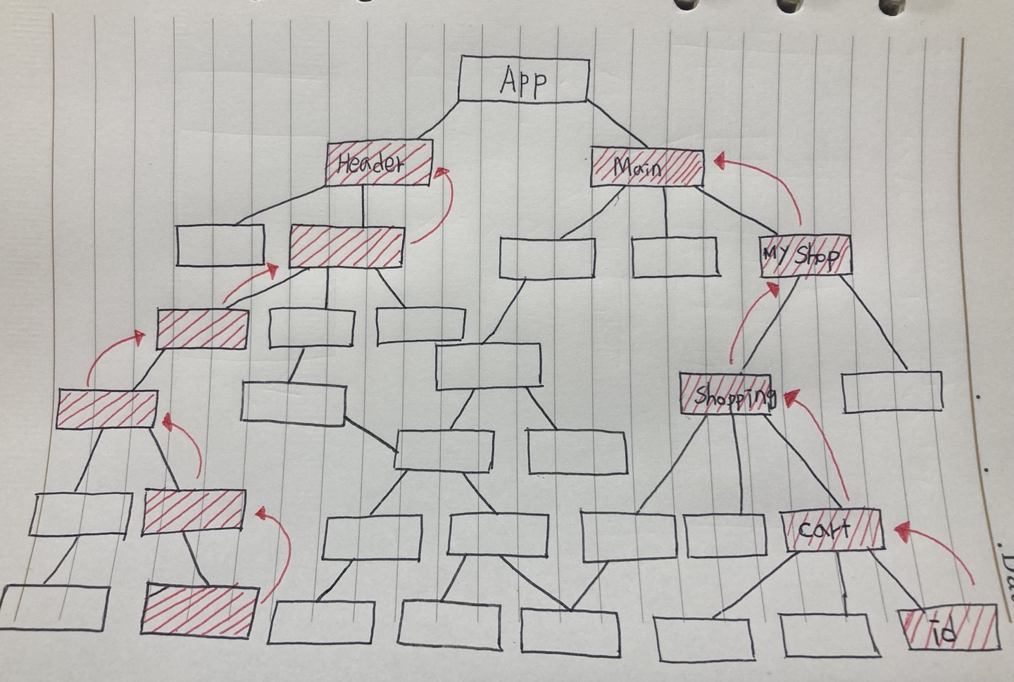 이건 예시로 그려본 prop전달 상태이다 ㅋㅋㅋ 상태를 전역에서 관리하지 않는경우, 컴포넌트 트리 구조에서 이런 상황이 여러개는 생길텐데,, 어디서 부터 흘러온건지 찾다가 시간이 다 가고 말것이다.