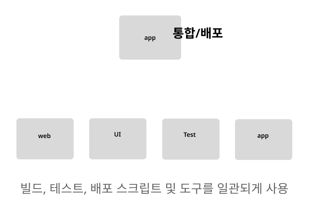 일관된 도구 및 스크립트 사용: 공통된 빌드, 테스트, 배포 스크립트 및 도구를 전체 저장소에 걸쳐 일관되게 사용할 수 있다. 이는 개발 프로세스의 표준화에 도움이 된다.