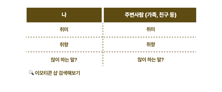 취미, 취향 이모티콘을 만들시에는 이렇게 한번 쭈욱 적어보면 좋다.