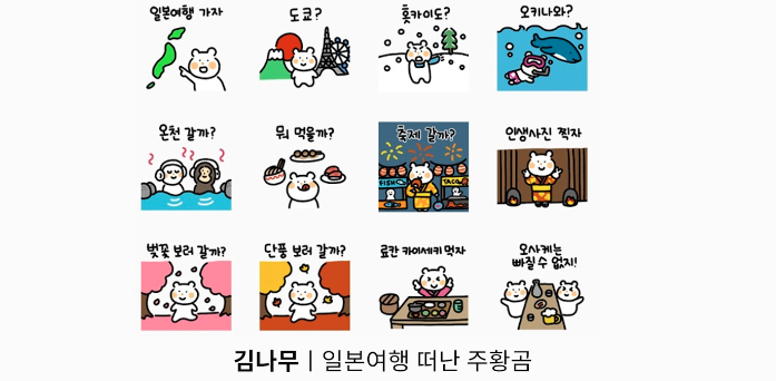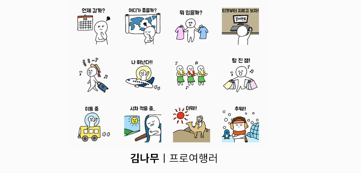 김나무 작가님께서 여행하는것을 좋아해서 ‘여행을 위한 이모티콘이 있으면 좋겠다’ 싶어서 만든 이모티콘이라고 한다.