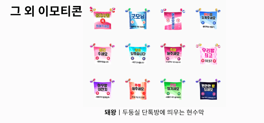 이모티콘인데 내용은 대화방 안에서 쓰기 좋은 메시지들이 들어가있다.