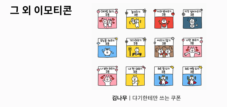제목처럼 쿠폰이 컨셉인 이모티콘으로 애인에게 요구하는 이모티콘이다. 그냥 요구사항을