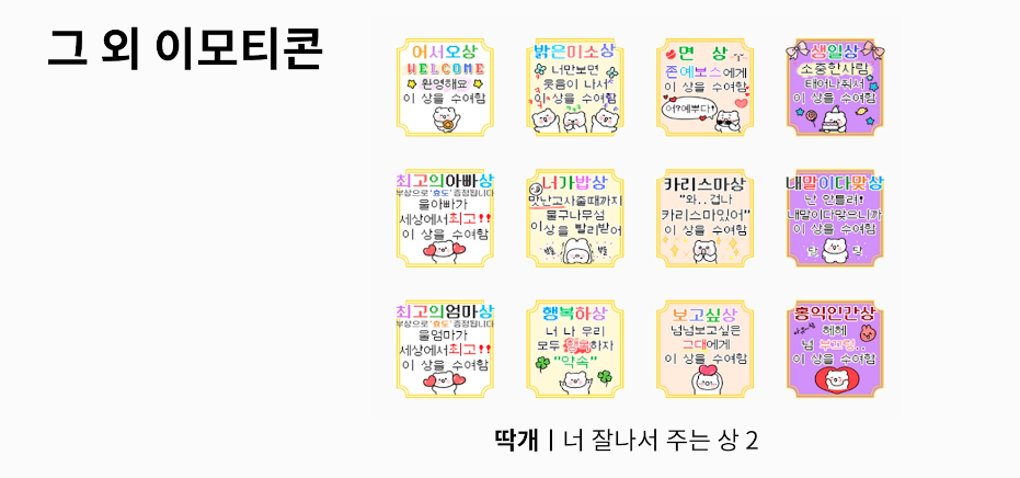상 이름을 재치있게 지어서 더 재미있게 사용이 가능한 이모티콘이다.