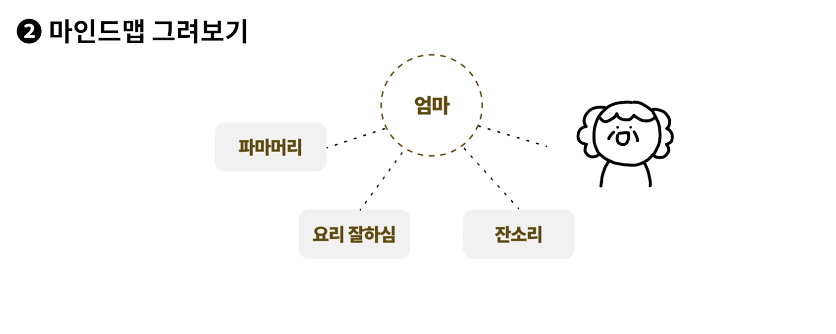 그림부터 그리기 시작하면 어떤 말과 행동을 그려야할지 자꾸 막히게 되는데 먼저 마인드맵을 그려서