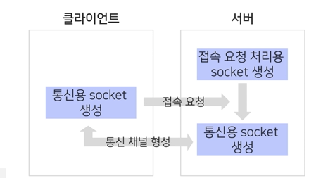 대기하는 소켓을 두고, 연결요청을 받아 별도의 소켓을 만들어 클라이언트와 소통하게 만든다.